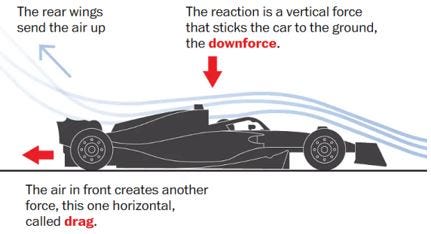 The air that is sent up by the rear wing in turn pushes it down — this is downforce.